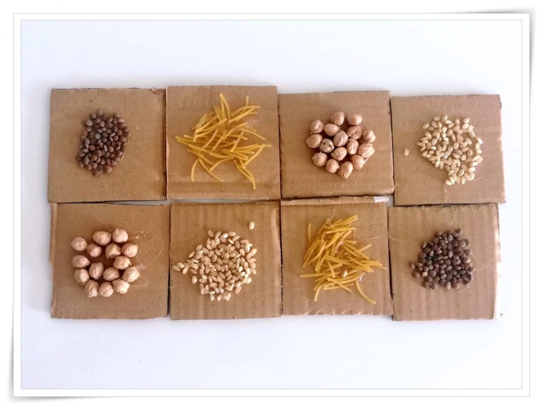 Per crear-lo necessitarem un tros de cartó, una mica gruixut si pot ser, cola i diferents materials com llegums o pasta. En primer lloc, retallarem el cartó en quadrats iguals. Després ja només caldrà enganxar el gra que vulguem amb cola i deixar-lo assecar. Fàcil oi?